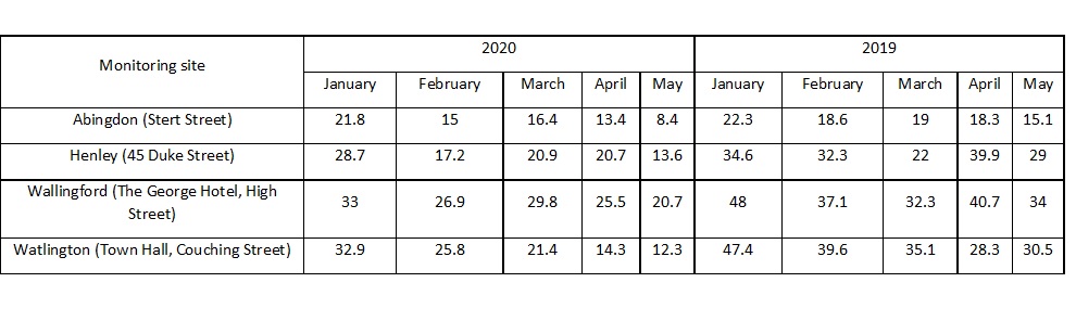 The analysis of the diffusion tubes can only be reported on an annual basis, but it is anticipated they will show a reduction in nitrogen dioxide for 2020 over the wider districts.