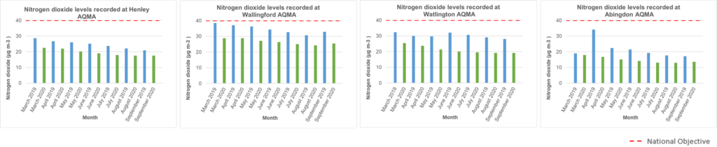 This has resulted in fewer miles driven, especially at peak times. With less congestion at peak times there has been less air pollution….  considerably less air pollution according the analysis carried out by South Oxfordshire and Vale of White Horse district councils’ Air Quality team.