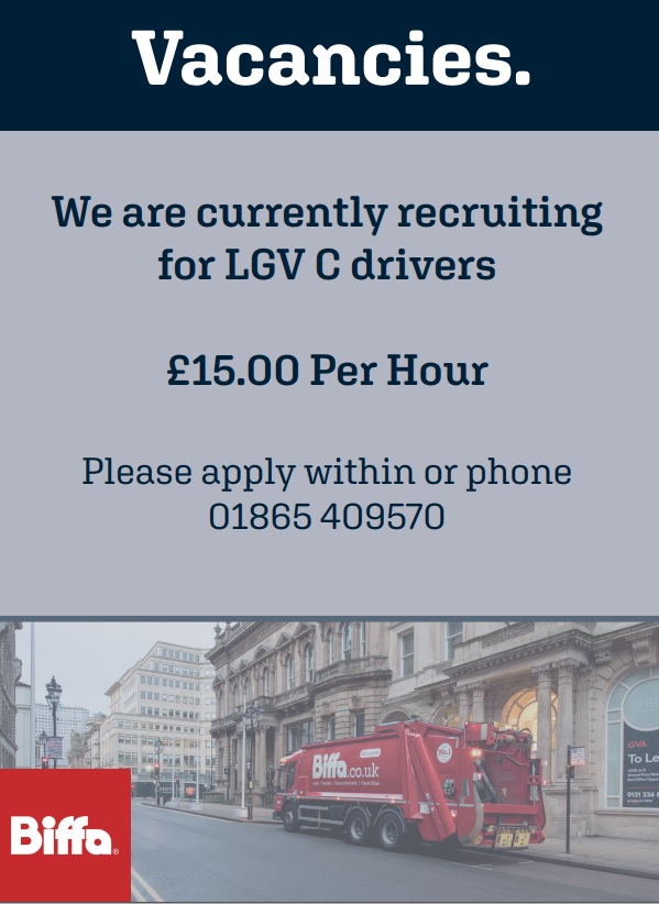 - Our waste contractor, Biffa, is currently recruiting loaders. The rate is £11 per hour. To apply call 01865 409570.