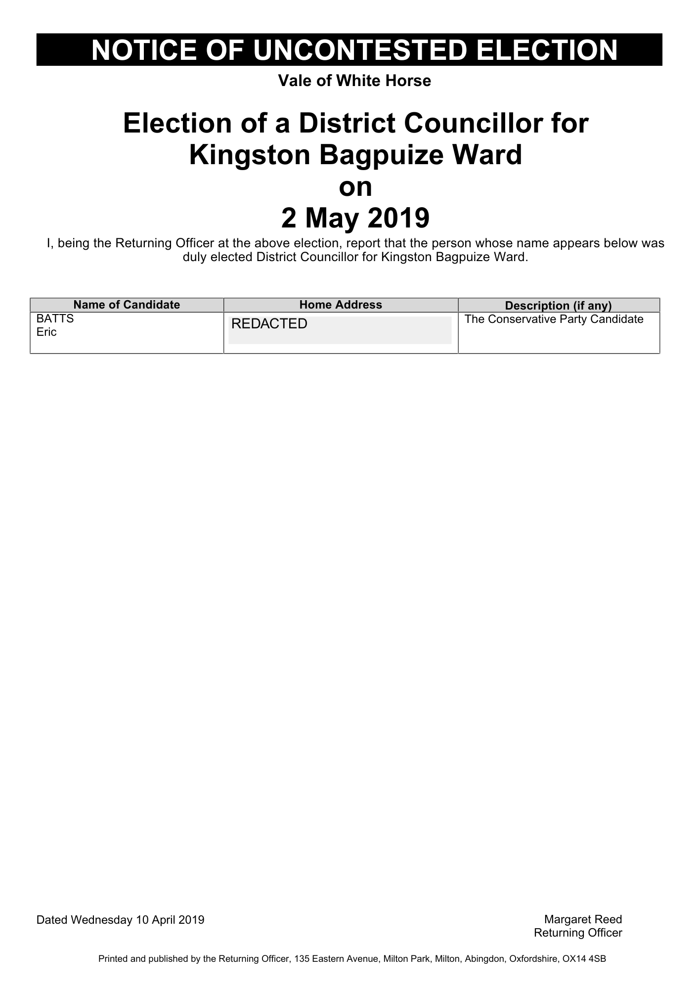 - Wantage Constituency: Declaration of result of poll – Wantage