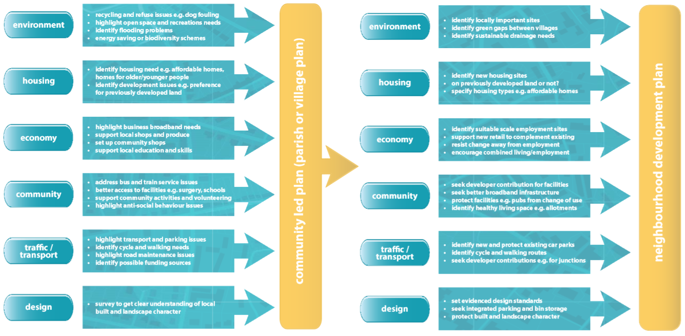 To see some examples of what the different types of plans are for, and how a community led plan can help you create a neighbourhood plan, take a look at this diagram.